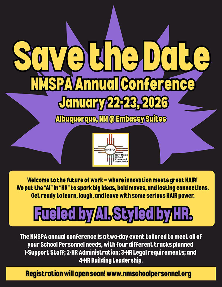 Who is NMSPAThe New Mexico School Personnel Association (NMSPA) is a coalition of school human resources administrators and professionals whose mission is to provide information, resources, and professional development related to personnel issues within the education profession. |